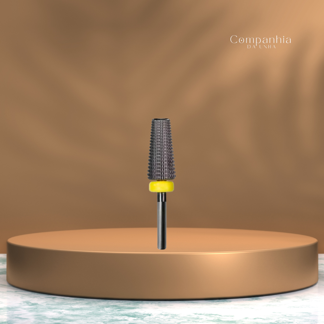 A Broca de Tungstênio com anel amarelo possui granulação ultra fina, sendo ideal para refinar o acabamento do alongamento e remover excessos com extrema precisão, sem agredir a estrutura da unha.